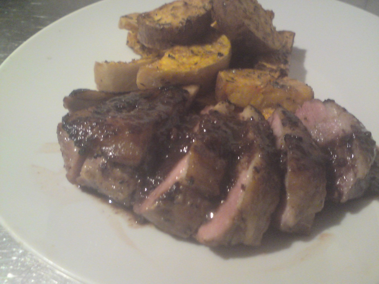 Take the vegetables out of the oven and add the duck breasts, skin side up and return to the oven for about 10 minutes (for medium). Turn off the heat, leave the oven ajar and let rest for 5 minutes. To serve, slice up the duck thickly, spoon over the sauce and serve the vegetables on the side.