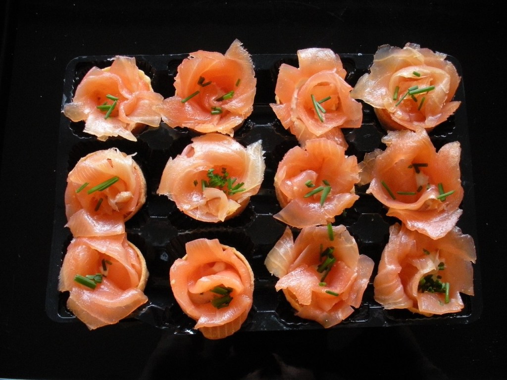Mix together ¼ cup soft curd or cream cheese, ¼ cup creme fraiche, 1 tbsp white horseradish cream, 2 tsp lemon juice, some chopped chives, and pepper. Using a spatula, drop the mixture into the corner of a small plastic bag (to form a cone). Snip off the end of the bag with scissors and pipe into pre-made savoury pastry cups. It helps if you leave a little border around the edge of the cream. Then take strips of smoked salmon and circle them upright in the case (starting on the outside edge inwards). Using scissors you can snip the tops to make “petals”. You will need about 5 slices of smoked salmon (140g). Finish with a garnish of chives.