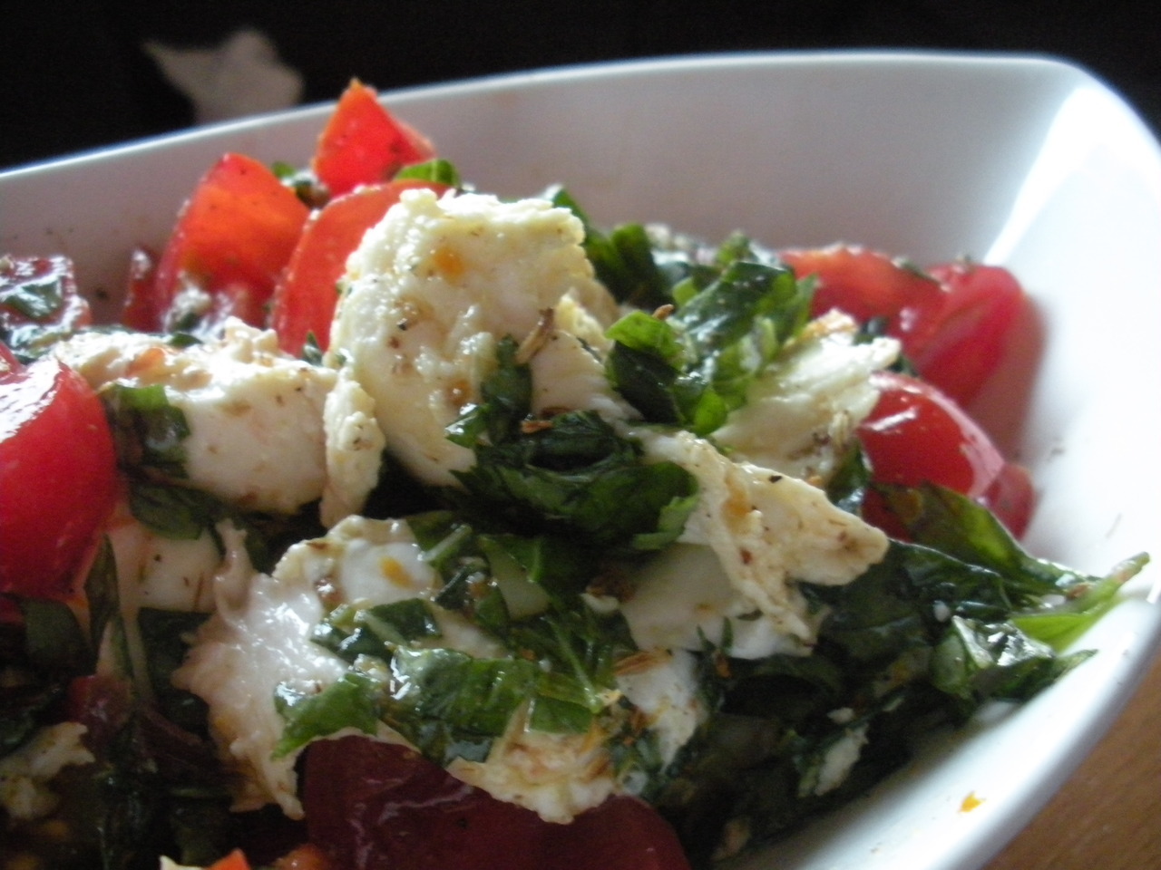 Dry fry ½ tsp of fennel seeds till they start to pop. Crush in a mortar and pestle. Now add one garlic clove, peeled and crush. Mix in a small handful of shredded basil leaves (around 15), 2 tsp chopped oregano, the grated zest of 1 lemon (I substituted orange rind and the results were brilliant!), 2 tsp olive oil, 2 tsp rapeseed oil, ½ tsp Maldon sea salt. Mix in 250g buffalo mozzarella broken by hand into chunks. Set aside for 10-15 minutes. Cut 2 ripe tomatoes into wedges (cherry tomatoes will do just as well) and plate up along with the marinated mozzarella. Drizzle with extra olive oil and season with freshly ground pepper.