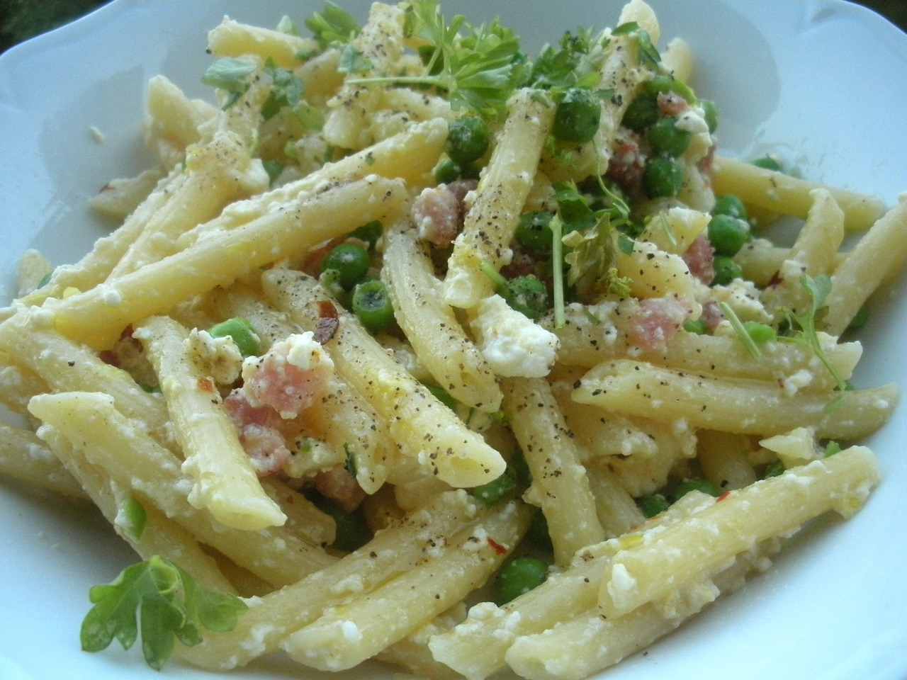 Add the cooked pasta and peas to the pancetta, along with the 100g ricotta (crumbled), the saffron, the zest of 1 lemon, some freshly ground pepper and some sea salt. You may need to add a little cooking water to loosen the sauce.