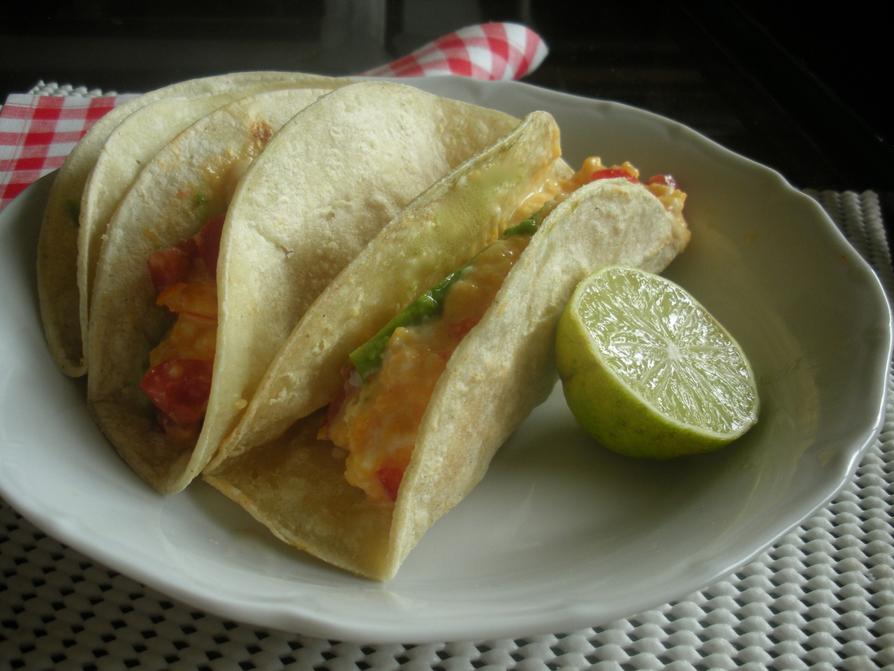 In a small pan wiped with a little cooking oil, break two eggs and add a small handful of grated white cheese. Scramble the eggs on medium heat till they reach the desired consistency. Stir in 4-6 quartered cherry tomatoes. Season with sea salt, pepper and a little chilli sauce. Pile into 3-4 corn tortillas, warmed (either in the microwave or in a dry, covered pan on the hob), add a slice of avocado and a squeeze of lime.