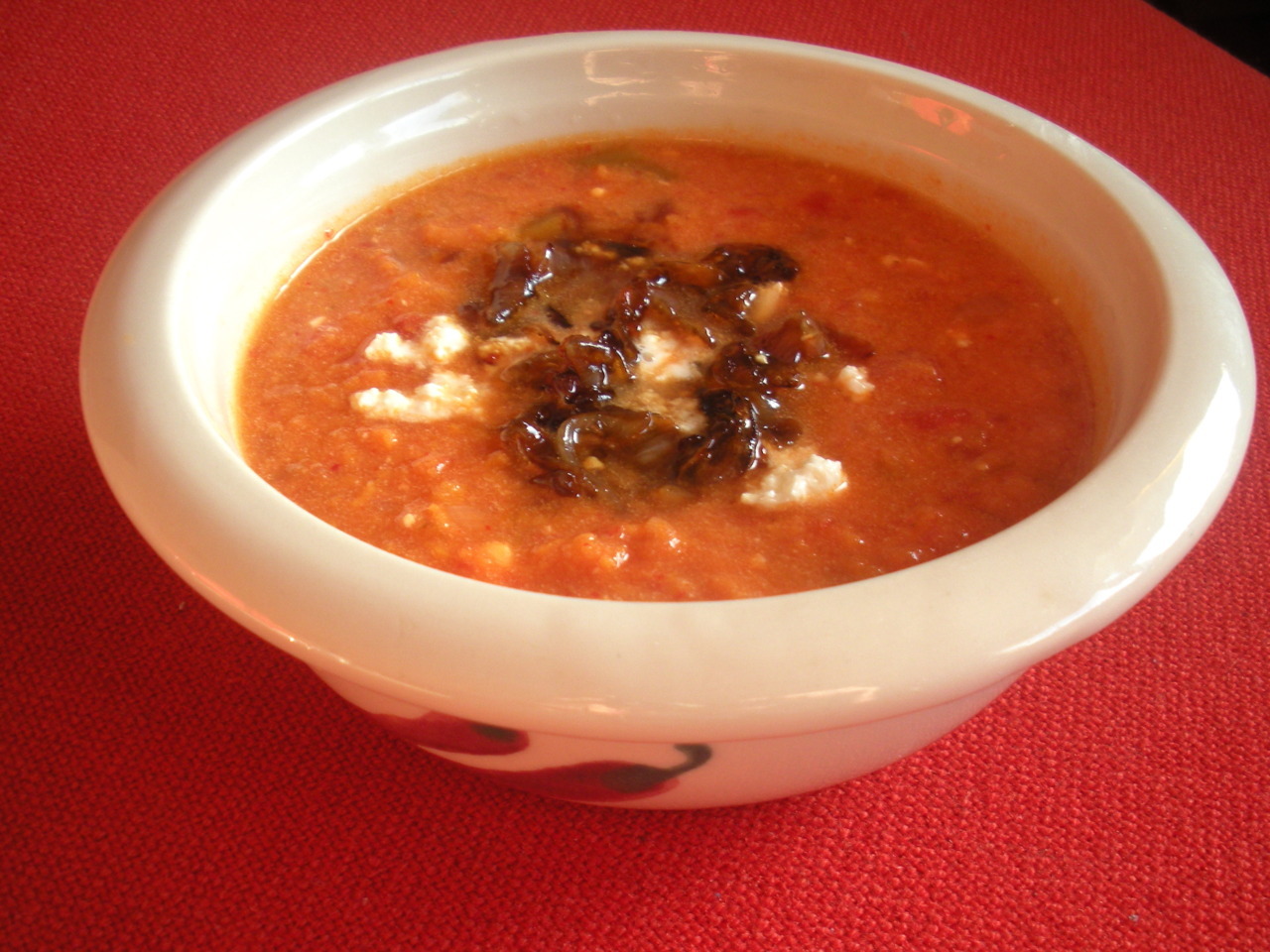 In a pot saute 1 red onion, thinly sliced in 1 tbs olive oil till the onion starts to colour. Add three chopped scallions and stir for a few minutes more till they start to soften. Add 2 tbs mirin (sweet Japanese cooking wine) and let evaporate. Add 450g sweet potatoes, peeled and chopped, 2 tsp harissa paste, 500ml vegetable stock and 1 cup canned, chopped tomatoes. Bring to a boil and then simmer, covered for about 30 minutes.