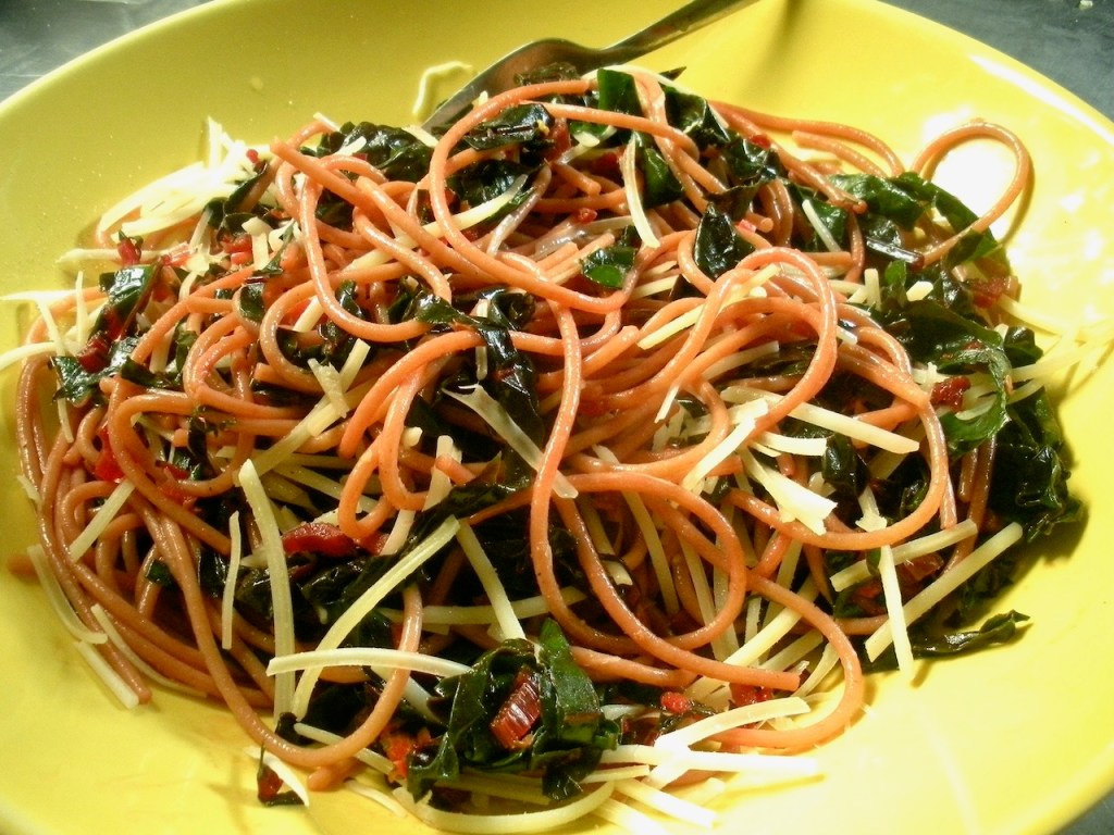 Drain the pasta when al dente and return to the pot. Add the swiss chard and stir around till well incorporated. Add some shredded parmesan and a drizzle of olive oil and serve straight away.