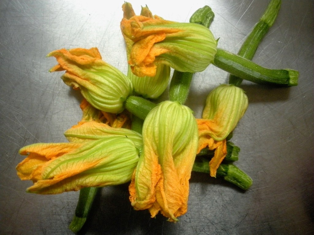 In a bowl mix whisk together 3tbsp flour, a sprinkling of thyme, and a pinch salt with a little water to form a loose paste. Dredge 6 courgette flowers till well-coated in the batter and then fry in a little rapeseed/canola oil till golden on both sides. Place on kitchen towel to soak up any extra oil and serve sprinkled with a little sea salt.