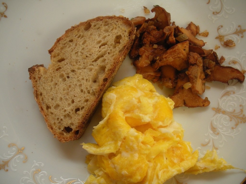 Take about a cup of cleaned and sliced chanterelles mushrooms and add to a pan with a good knob of butter. Throw in a finely chopped shallot and stir around till the everything has softened nicely (making sure any excess water from the mushrooms have evaporated). Season with sea salt and pepper. Serve with a simple scramble of eggs and some rye toast on the side.