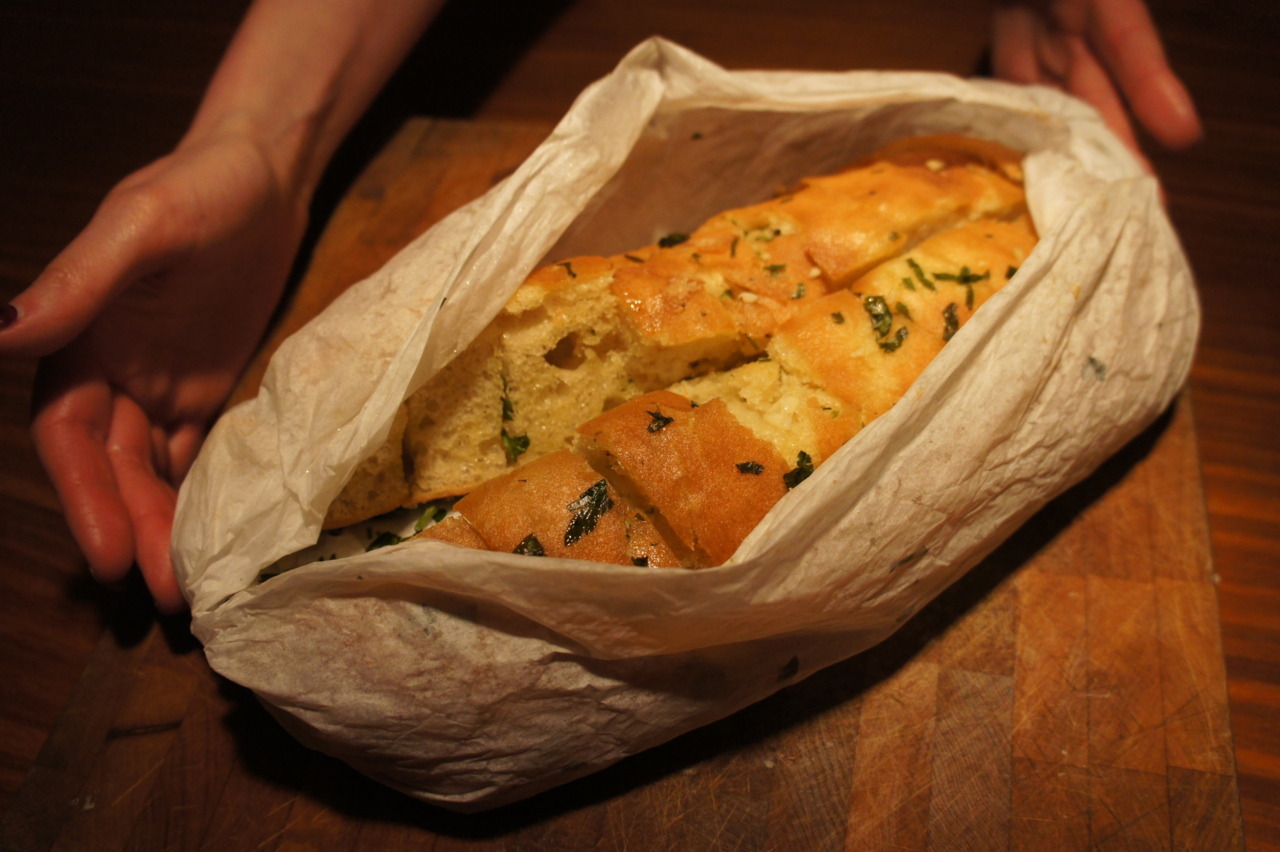 Slice a large ciabatta lengthwise, making sure you do not go all the way through the bottom crust! Now cut crosswise at 3 cm intervals – again, making sure you don’t go all the way through. Scrunch up a large piece of greaseproof paper under the tap and then lay flat on your counter. Place your ciabatta on the paper. Sprinkle a small bunch of finely chopped parsley all over the ciabatta (including under). Drizzle olive oil over (and inside) the ciabatta. Scatter 3-4 finely chopped garlic cloves between the slices. Season with sea salt and pepper. Seal up the package quite well and place in a hot oven (180c).