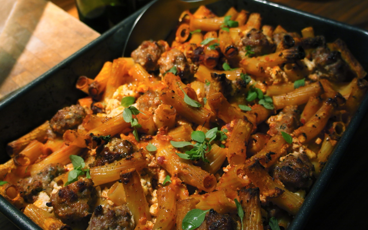 Slit open 400g spicy Italian sausages (or I used the same amount of high-quality sausage meat combined with 1 tsp smoked paprika, 1 tsp chilli flakes and a sprinkling of dried thyme and sea salt). Form into 18 small balls and distribute evenly over the pasta, pushing them down slightly into the pasta. Finally, take 150g fresh ricotta cheese and dot around the pasta in small pieces, much like the sausage.
