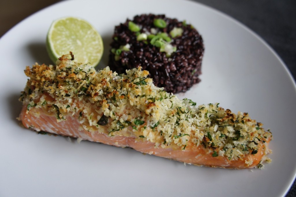 Place two salmon fillets close together on a non-stick baking tray (unsmoked salmon also works well in this recipe). Brush with 1 tbs Tewksbury mustard (or a combo of French mustard and creamed horseradish). In a bowl mix together 2 tbs finely chopped parsley, 1 tbs finely chopped fresh thyme, 1/3 cup Panko (Japanese breadcrumbs – or regular breadcrumbs can be substituted), the zest of 1 lime, the juice of ½ lime, some sea salt, and a sprinkle of wasabi powder (optional). Top the salmon fillets with the crumb topping and place in a hot oven (200c) for around 12 minutes (or till just a little underdone).