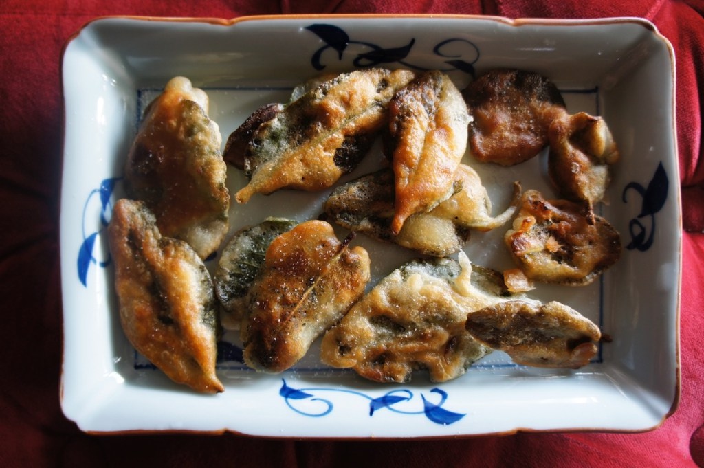 In a shallow bowl whisk together ½ cup flour with ½ cup water till you get a thickish paste. Heat 1/3 cup rapeseed/canola oil in a non-stick pan. Dip 10-12 large sage leaves in the batter and then let the batter drip off before placing flat in the pan. Flip over once crisp and golden. Remove once the other side is also crisp and golden. Drain on kitchen towel and sprinkle with sea salt before serving.