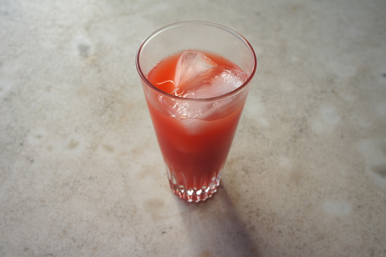 A refreshing summer drink – the sweetness of the strawberry liqueur and orange juice being offset by the bitterness of the Campari and grapefruit juice.