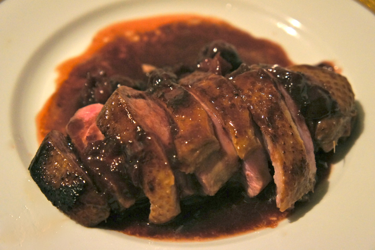 Meanwhile, heat a large pan over medium heat. Remove the duck from the marinade and place skin side down in the skillet. Cook until much of the fat has melted into the pan and the skin is crisp (around 10 minutes). Turn over and continue cooking to desired doneness (no more than 5 minutes for medium rare). Transfer to a cutting board, cover with foil and let rest a couple minutes while you finish the sauce.