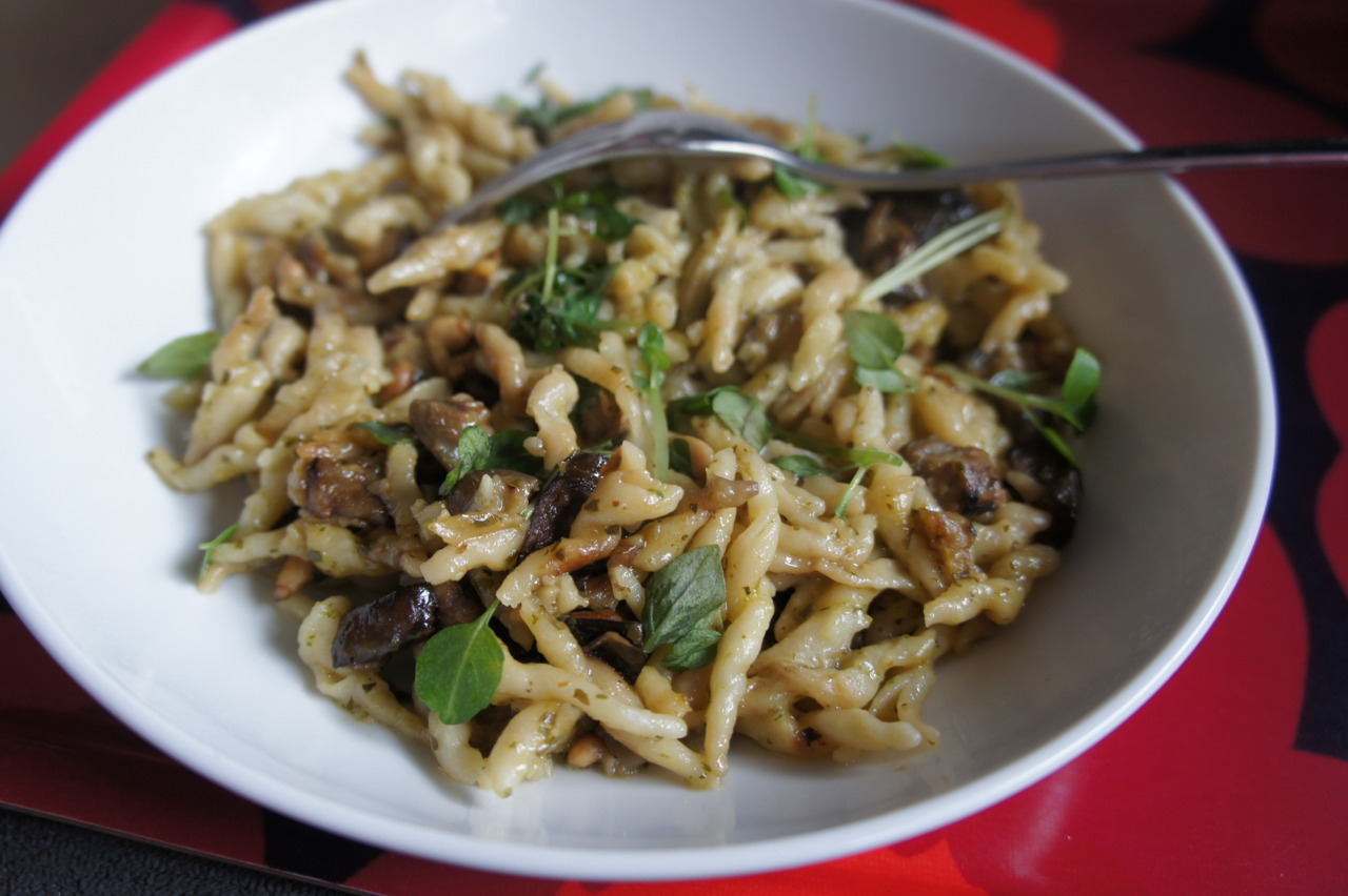 Drain the pasta, setting aside a cup of the cooking water. Add the pasta to the aubergine, add a few heaping tablespoons of good quality fresh pesto, stir in enough of the cooking water to create a thick sauce. Add a good sprinkling of grated parmesan, season with sea salt and pepper and stir.