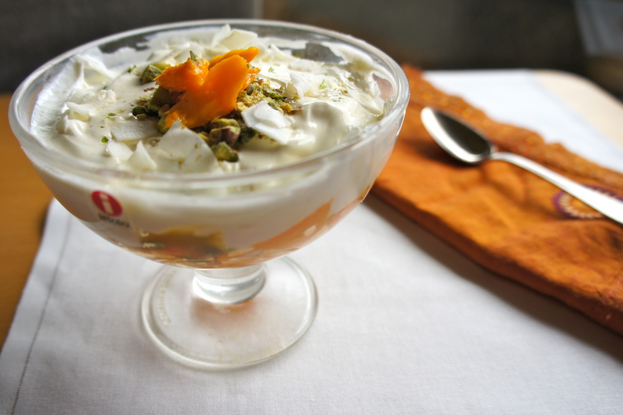 Peel and chop and an alphonso mango (or use half a regular-sized mango) and place in a bottom of a sundae dish. Sprinkle with finely chopped mint and lime zest. Top with passion fruit jam*. Add a layer of Greek yoghurt or more decadently, extra thick Jersey cream, and then sprinkle on dried coconut flakes and chopped pistachio.