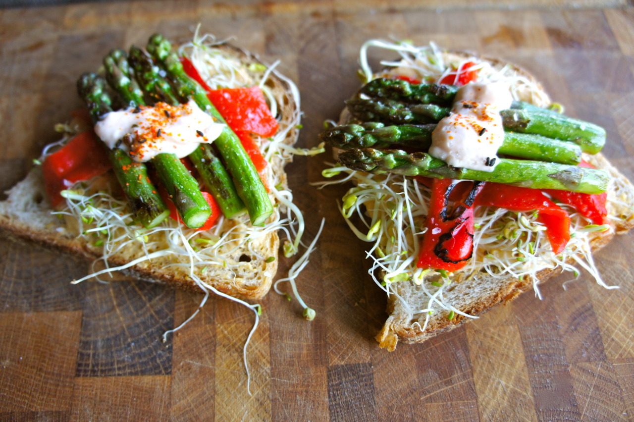 To assemble, on each of the slices spread on good-quality hummus, top with alfalfa sprouts, lay over some sliced roasted red pepper (from a jar will do), line up the asparagus tips, add a dollop of the sauce, and finely, add a sprinkling of sea salt and shichimi togarachi.