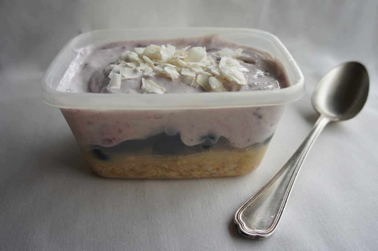 In a small mixing bowl mix together ½ cup Greek yoghurt, 2tsp blueberry jam (I like the low-sugar varieties, such as St Dalfour) and 1tsp agave nectar – to taste. Spread evenly over the muesli. Sprinkle with flaked coconut.