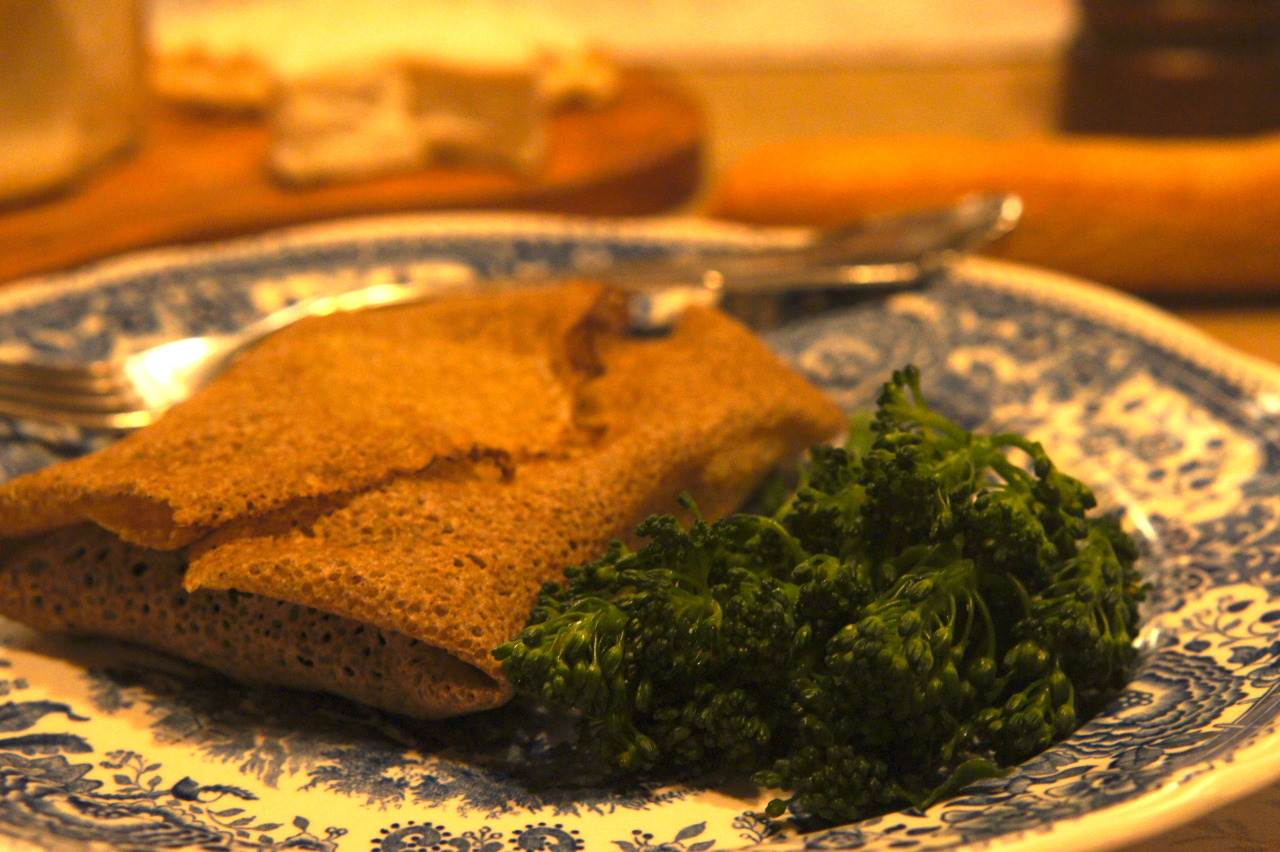 Repeat till you have used up all the greens and cheese. This should make around 6 large crêpes. Place a dollop of butter on each of the crêpes and place in a hot oven to warm through.