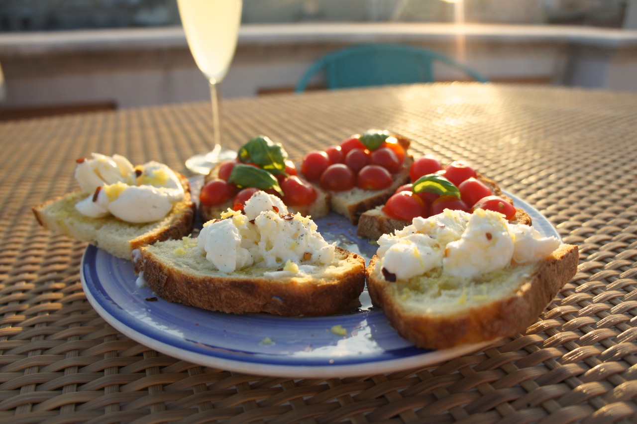 Grill slices of a rustic Italian country loaf. Cut slices in half, rub with a cut clove of garlic and drizzle with a little olive oil.