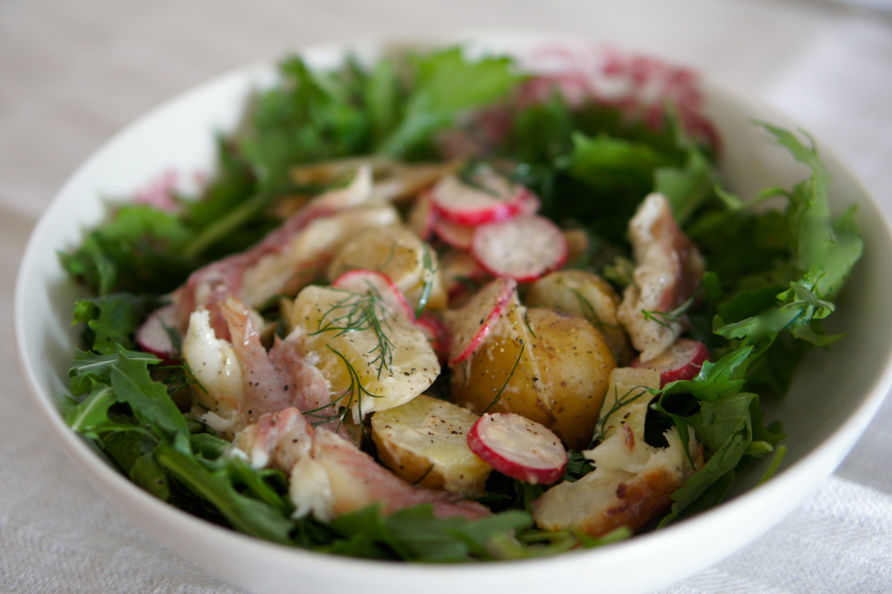 Meanwhile, in a large bowl mix together 2 tbs sour cream (or créme fraiche), 1 tsp Dijon mustard, 2 tsp grated horseradish, 2 tsp red wine vinegar, the juice of ½ a lemon, 2 tbs olive oil, some sea salt and pepper. Add a small handful of chopped fresh dill, and 8 radishes, finely sliced.