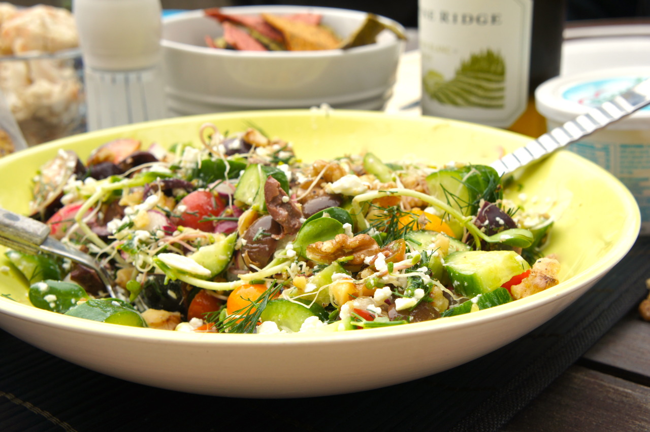 Meanwhile, in a large, shallow salad bowl add the following: 200g red and yellow cherry tomatoes, sliced in half, 2 small Persian cucumbers, quartered and sliced, 12 Kalamata olives, pitted and sliced, a large handful of micro greens (sprouts, pee shoots, etc.), 4 sprigs of dill, chopped, 1/3 cup walnuts, toasted and chopped, ½ cup feta cheese, crumbled, the shallots (discard the liquid) and a sprinkling of thyme leaves (dried).