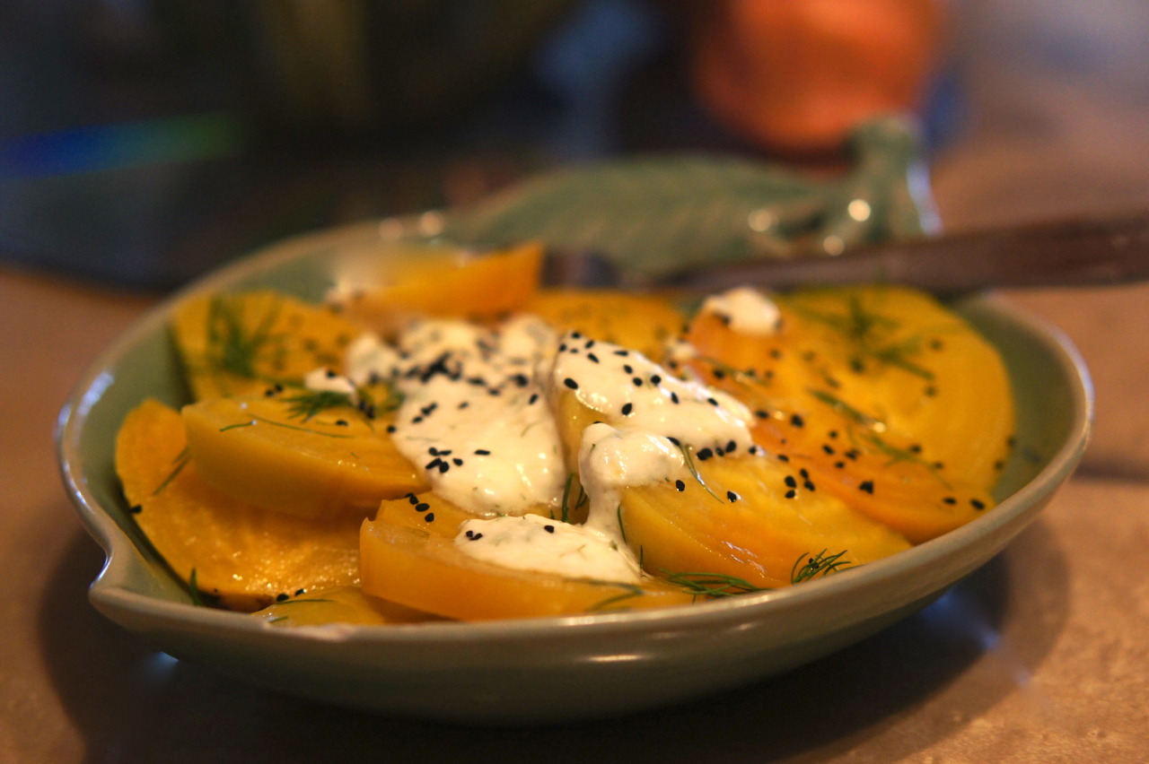 Place the beets in a serving dish, add dollops of the dill sauce, drizzle a bit more olive oil overtop, and garnish with Nigella seeds.
