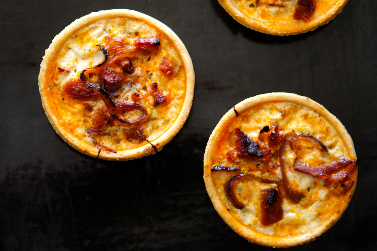 Distribute evenly between 6 pre-baked savoury shortcrust pastry tarts (store bought will do fine).