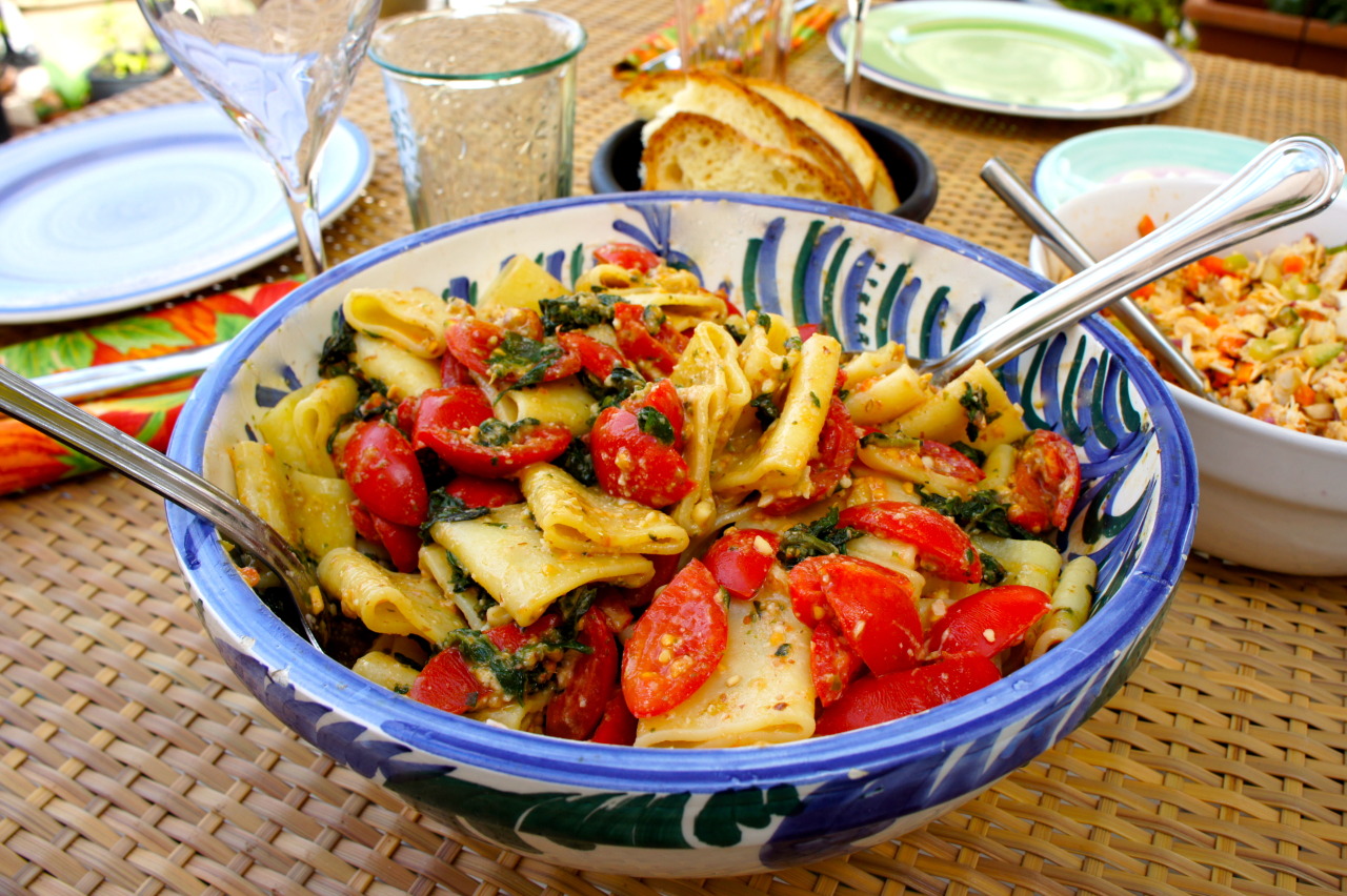 Boil up 500g paccheri or other similar pasta till just done. Drain, put back in the pot, along with the almond mixture and a good glug of olive oil and 150g parmesan or pecorino