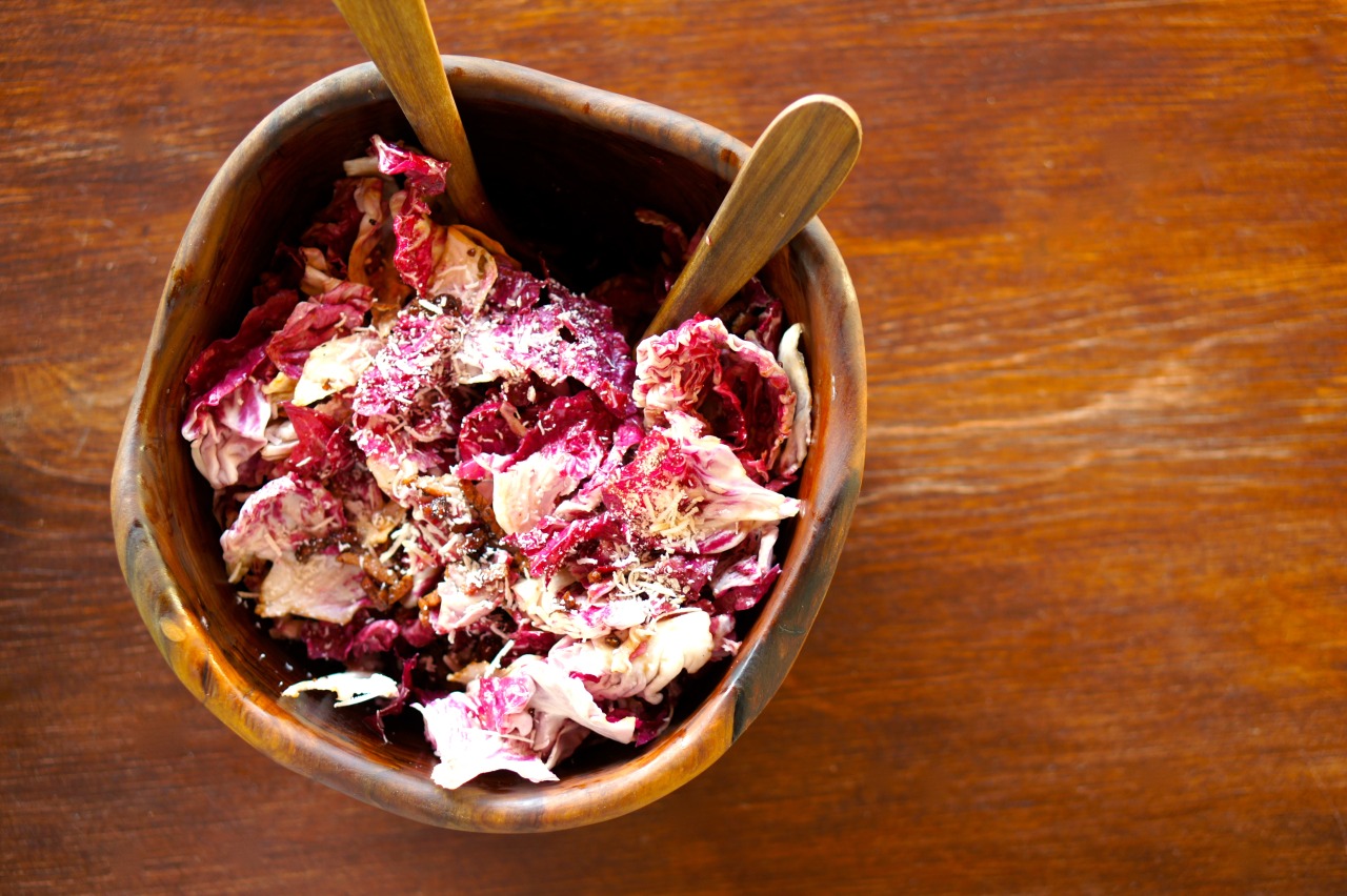 Add sliced radicchio to the bowl and toss well. Sprinkle with the pancetta and freshly grated parmesan.
