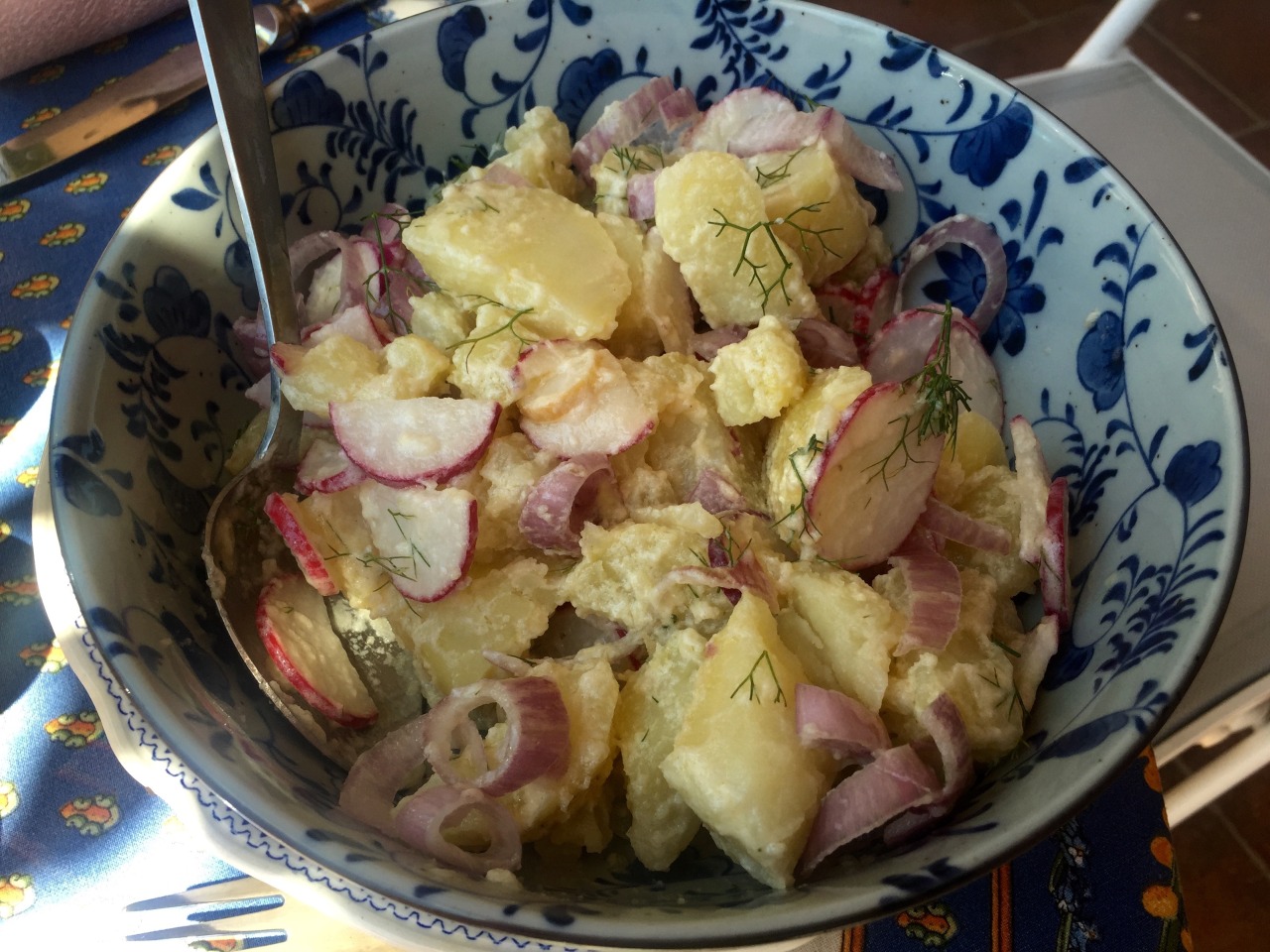 Mix in the radishes, the drained shallot, and a sprinkling of fresh dill (chopped).
