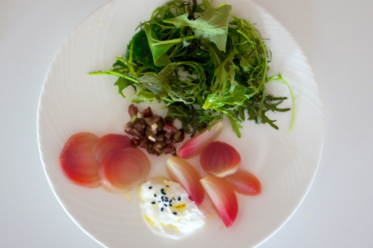 Serve alongside a large dollop of fresh goat’s cheese curds (drizzled with olive oil and sprinkled with nigella seeds), and mustard greens (seasoned with olive oil, lemon juice and sea salt).