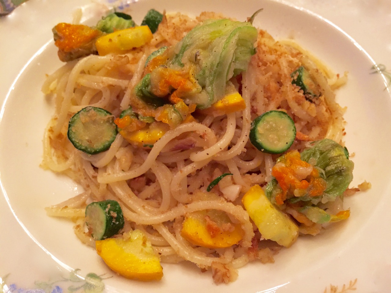 Add the cooked pasta to the courgettes, Stir in some of the cooking water to moisten the pasta and season with freshly ground pepper. Add a drizzle of olive oil and scatter the breadcrumb mixture over top. Garnish with the courgette flowers.