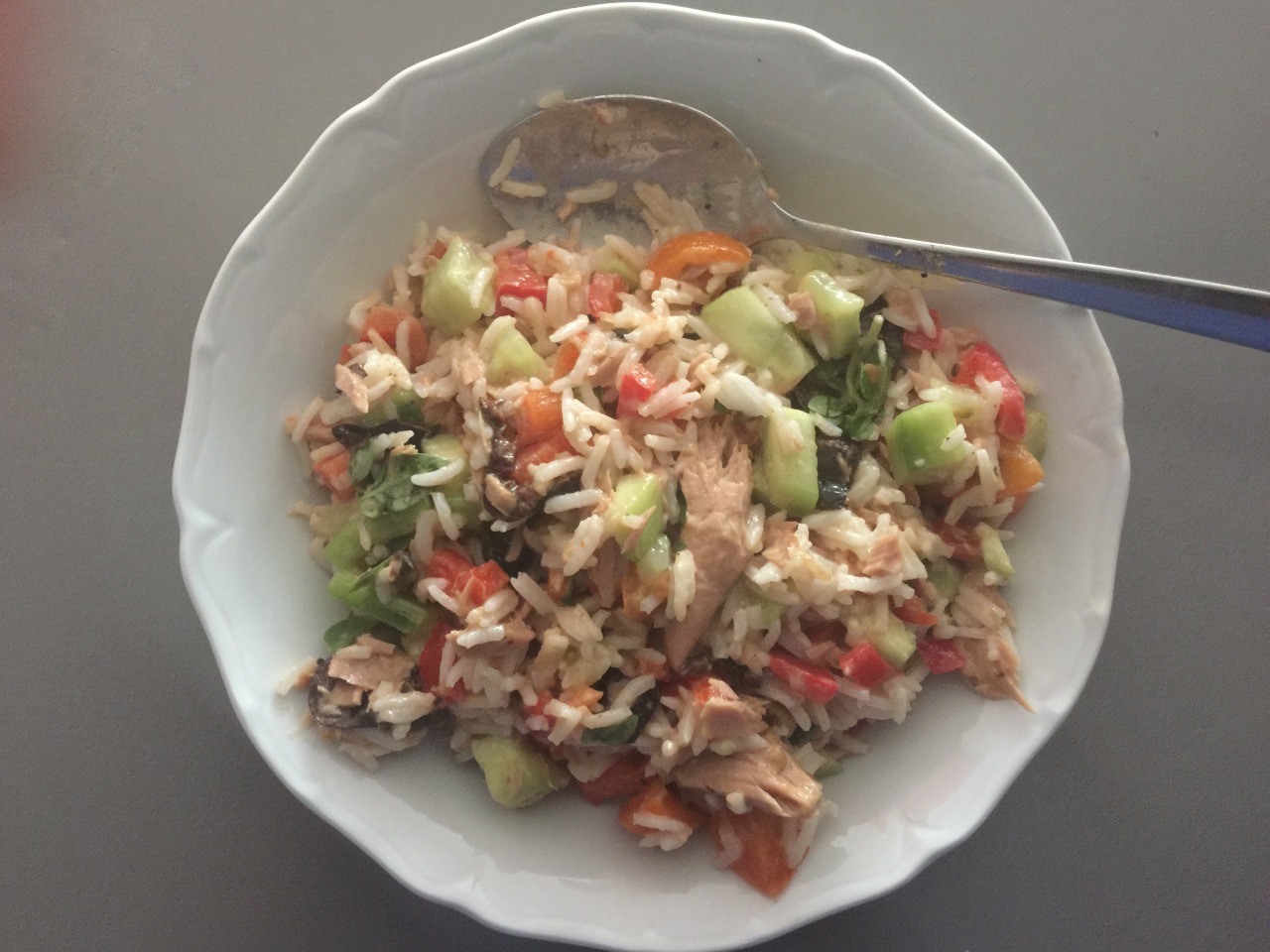 In a large salad bowl mix together: 2 cups cooked rice, 2 ripe tomatoes, seeded and finely chopped, 1 red pepper, seeded and finely chopped, 1 medium cucumber, peeled and chopped, some finely chopped herbs (parsley or basil), 200g good quality canned tuna, 2 large dollops of mayonnaise, the juice of ½ lemon, 1tbs Dijon mustard, 1tbs olive oil, and 1tbs sherry vinegar.