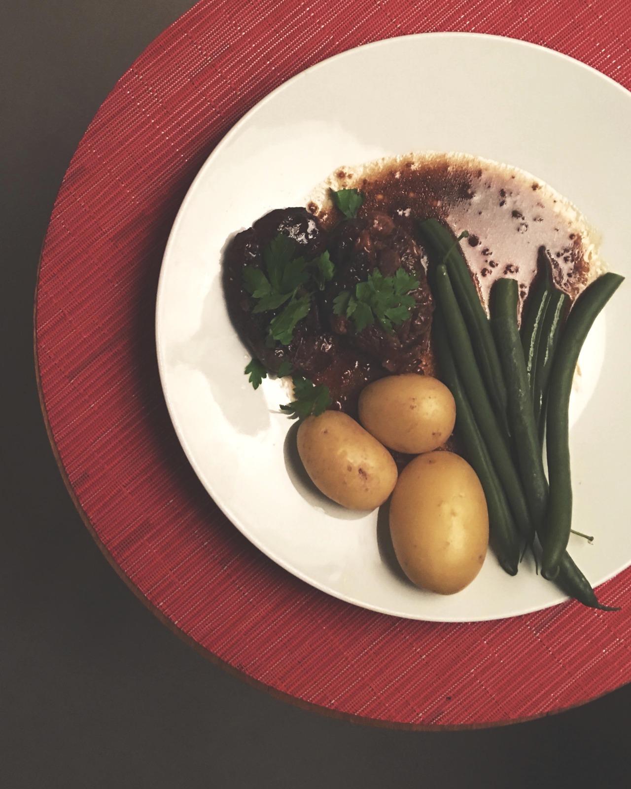 On the day: reheat the meat with the liquid from the Tupperware in an ovenproof dish for 30 minutes. Spoon the reheated, reduced sauce over the meat before serving.