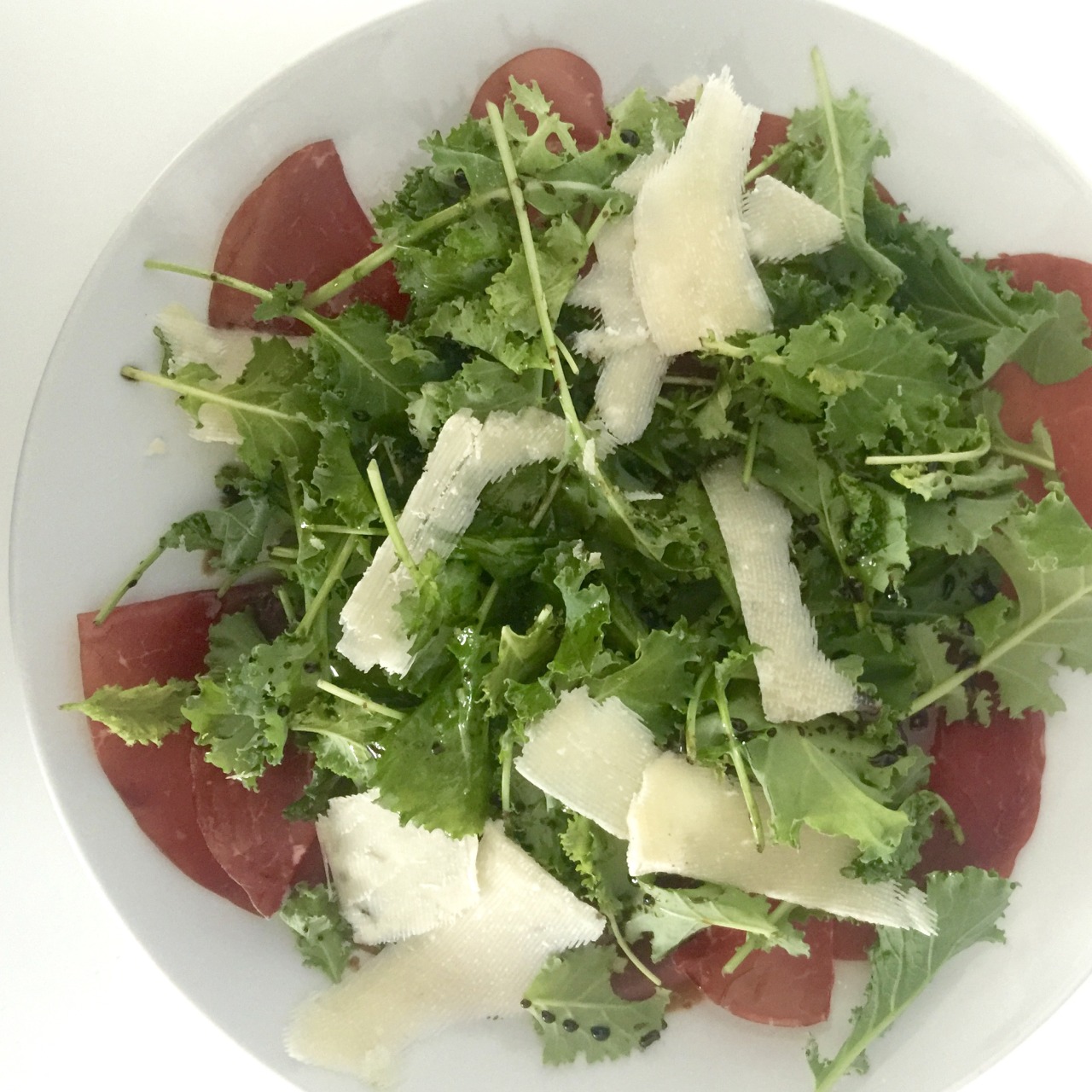 In a large dinner plate distribute thin slices of bresaola, folded over. Add a large handful of baby kale leaves to cover. Drizzle with good olive oil and a thick balsamic vinegar. Season with sea salt and pepper. Add shavings of Reggiano parmesan.