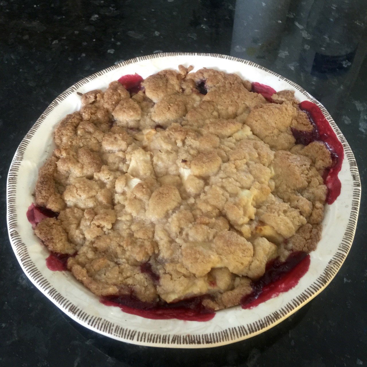 In a food processor place 180g flour, 90g sugar, 90g butter, a pinch of salt and a sprinkle of cinnamon. Pulse until the ingredients start to clump up. Distribute the clumps/topping to cover.
