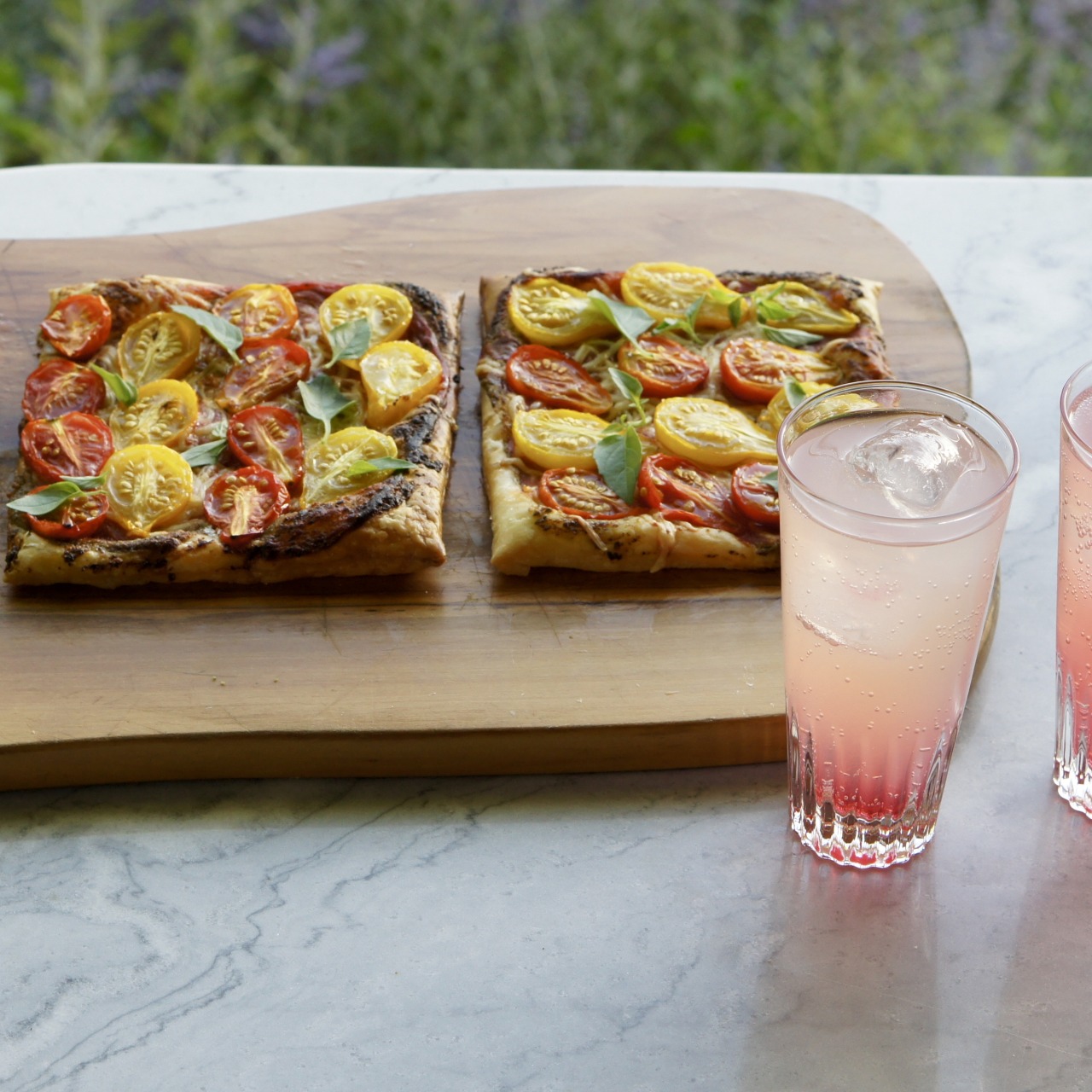 Spread 1tbs of tomato sauce on each of the squares and sprinkle with a little grated hard cheese. Top with halved mini tomatoes or sliced for regular tomatoes. The riper the better. Season with sea salt, drizzle with olive oil, and sprinkle on a little dried thyme or oregano.