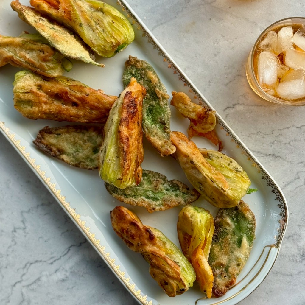 Dredge 8 courgette flowers and 8 sage leaves until well-coated in the batter and fry in vegetable oil until golden on both sides.