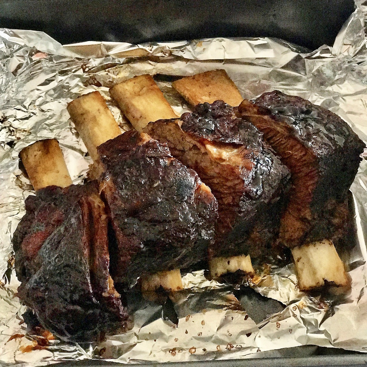 Take a rack of 4 beef short ribs and place in an oven-proof pot (just large enough to hold the ribs snuggly). Add 1 onion, 1 carrot, and 1 celery, (all coarsely chopped), 6 garlic cloves (bashed), and 4 star anise. Pour over 500ml porter beer and 500ml beef stock.