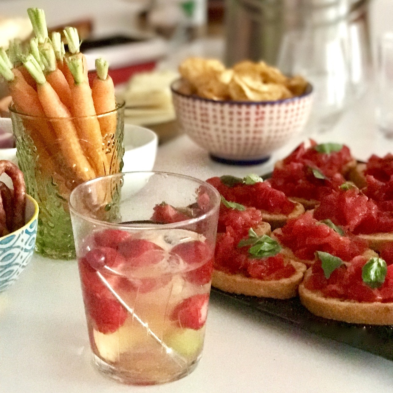 Just before serving, pour in 1 bottle of rosé prosecco, Serve over ice in glasses garnished with the fruit.