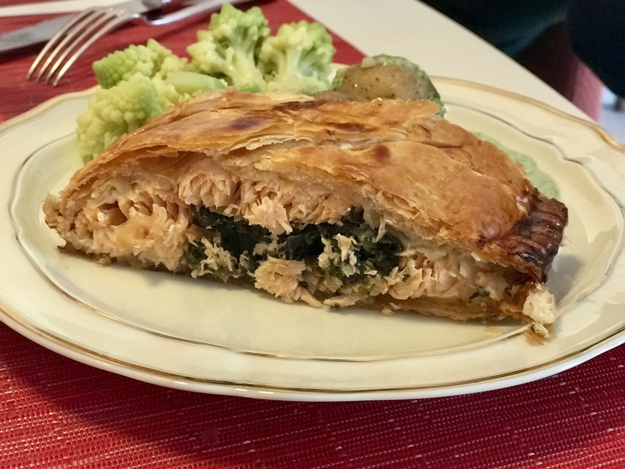 On a baking tray lined with greaseproof paper, place a pre-rolled puff pastry – gluten-free works fine too (320g), width-wise, with half the pastry off the sheet. Place the salmon in the centre of the pastry.