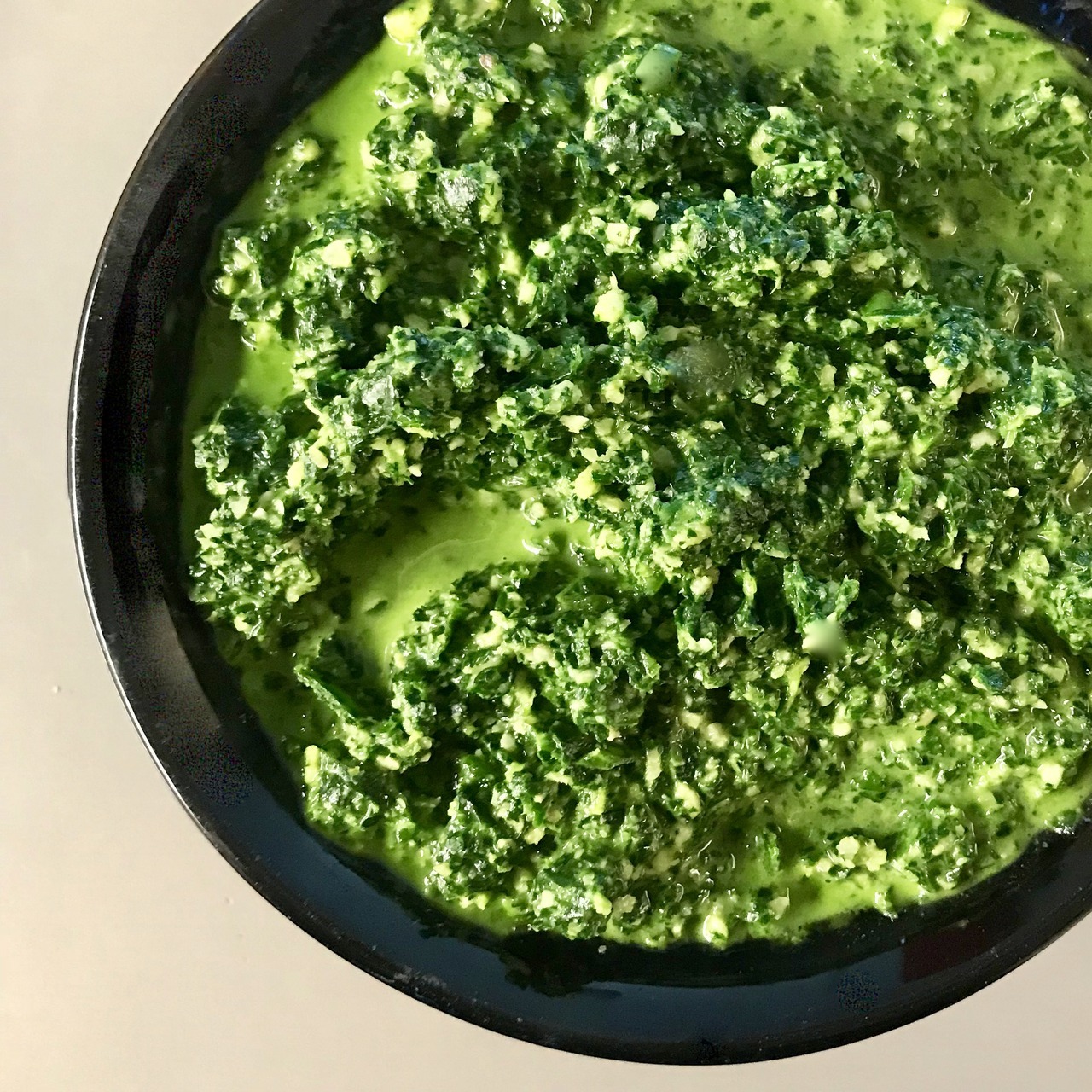 Now add a glug of olive oil, and a good pinch of sea salt and blitz. Add more olive oil till you obtain a glossy consistency.
