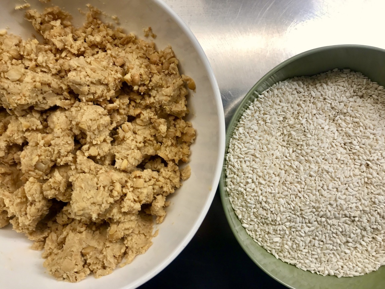 Add the koji/salt mixture to the bean paste (making sure the beans are at room temperature, otherwise the fungus in the koji will be killed). Mix well using your hands and form into large balls (around 6).