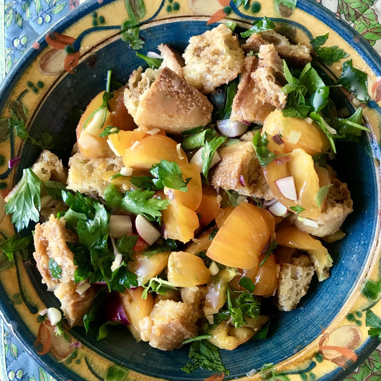 Add some finely chopped spring onions or shallots, chopped radishes. Season with salt and pepper, and mix to combine. Mix in any liquid which has collected at the bottom of the bowl.