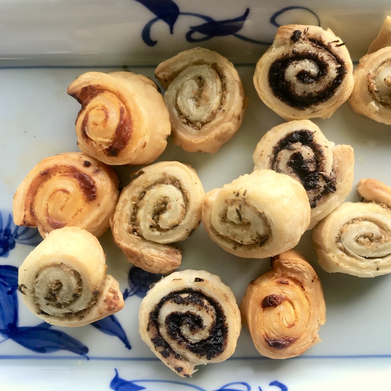 Roll out a piece of puff pastry and cut into large squares 14cm x 14cm (adjusting the size as required). Spread a thin layer of either black olive tapenade, green olive tapenade, or a sundried tomato pesto evenly across the pastry, leaving a 1cm border at one end.