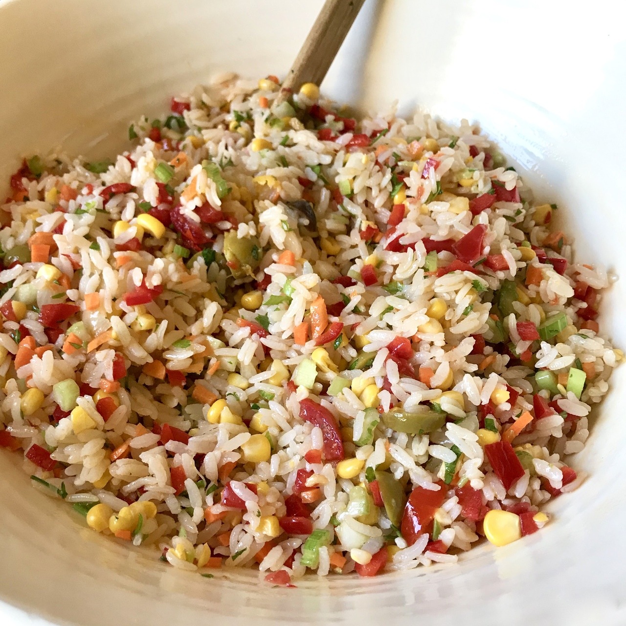 Add a handful each of green olives (sliced), black olives (sliced) and a few cocktail onions (optional) Add the kernels from one ear of corn (or substitute with canned). Add the juice of 1 lemon, and a drizzle of olive oil (up to ¼ cup). You can also add a couple tablespoons brine from the olive jar.