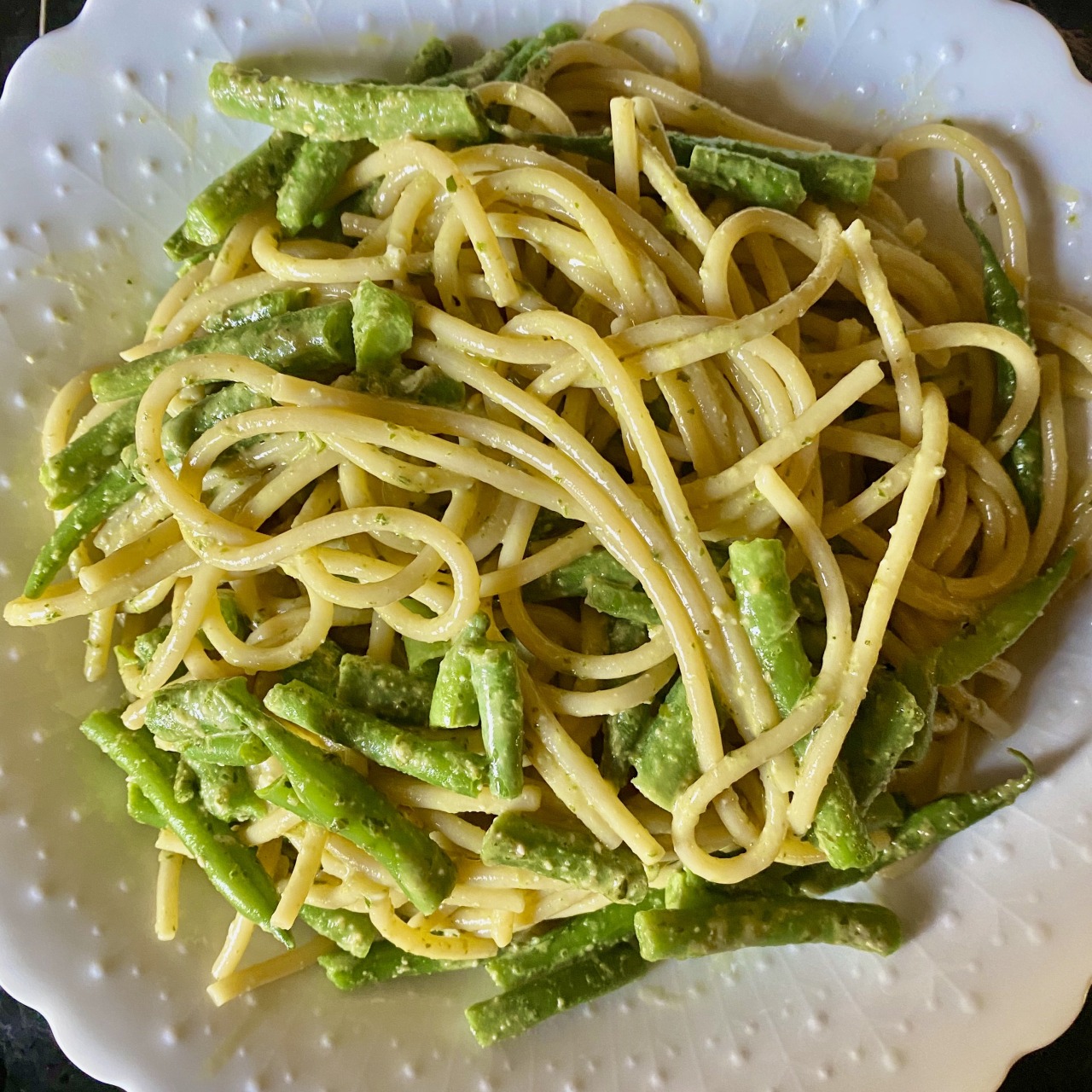 To serve, I boiled some chopped french beans till barely tender, drained the spaghetti over them in a colander in the sink to warm through then added everything, along with the pesto and some of the cooking water to a pan over medium heat to stir through before serving.