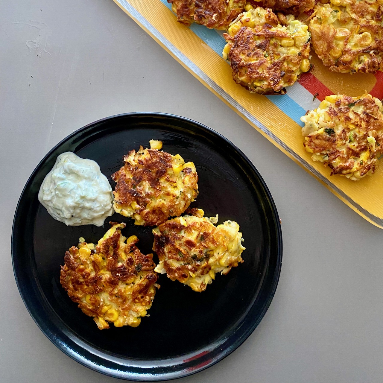 Place in a large bowl, along with the cooked kernels of one ear of corn, two garlic cloves, finely chopped, 1 spring onion, finely sliced, 3 – 4 tbsp fine semolina, 2 tsp cornstarch, a sprinkling each of salt, chilli powder and ground pepper. Mix together, adding a few tablespoons of plant-based heavy cream* (enough to combine everything into a very thick batter).