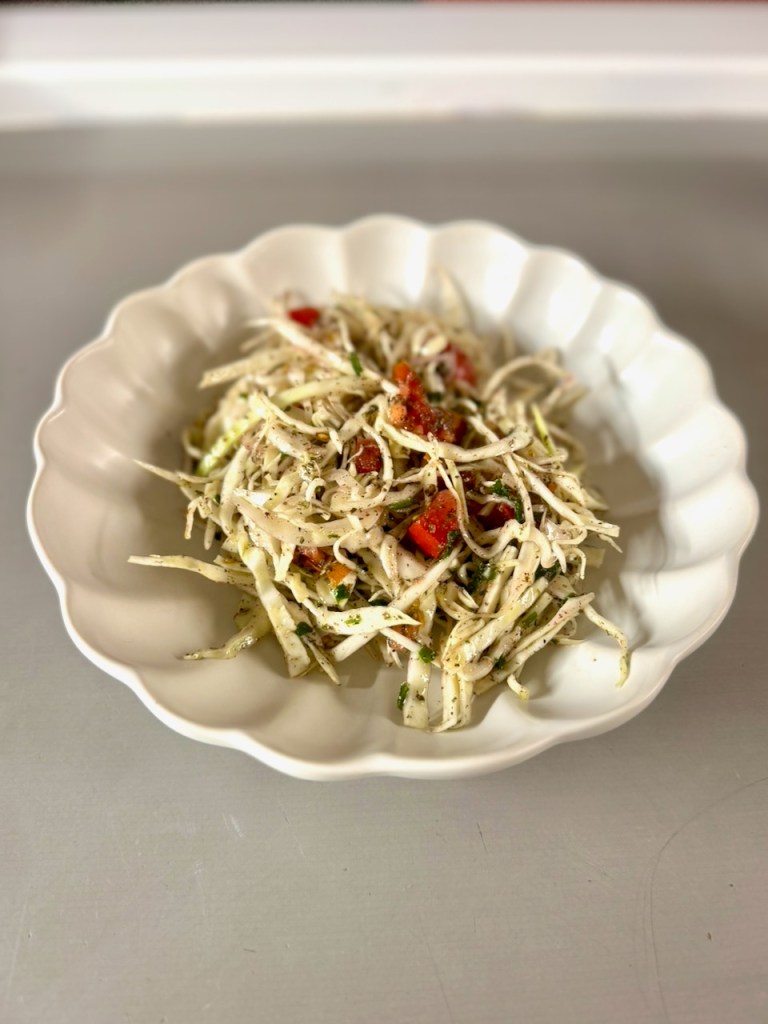 In a large mixing bowl, mix together 450g white cabbage, finely sliced (approximately half a small head of cabbage), 3 spring onions, finely sliced, two tomatoes, diced, a bunch of parsley, finely chopped, and a handful mint, finely chopped.