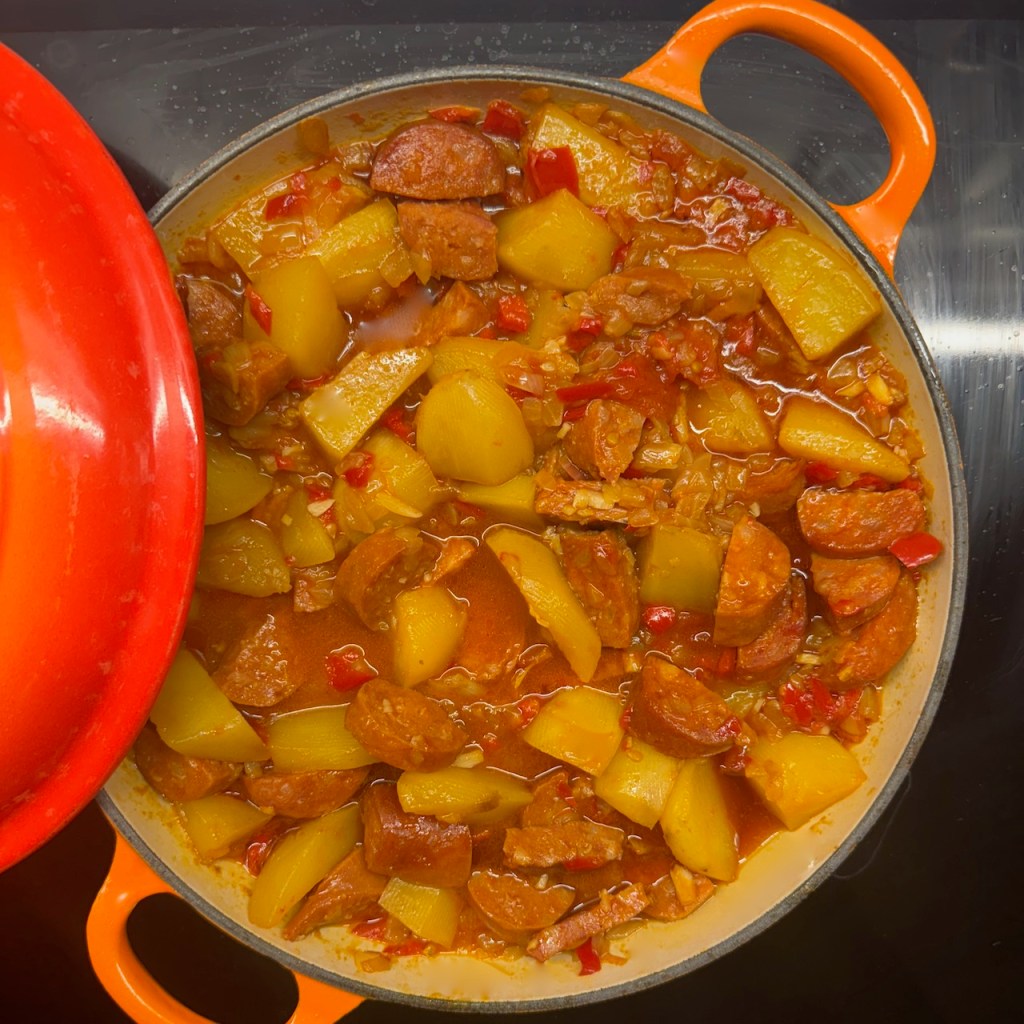 Pour enough water to cover the potatoes, cover and simmer for around 30 minutes until the potatoes are almost tender (turn the potatoes over halfway through cooking if necessary) Remove the cover and reduce the liquid till the potatoes are well coated in the sauce.
