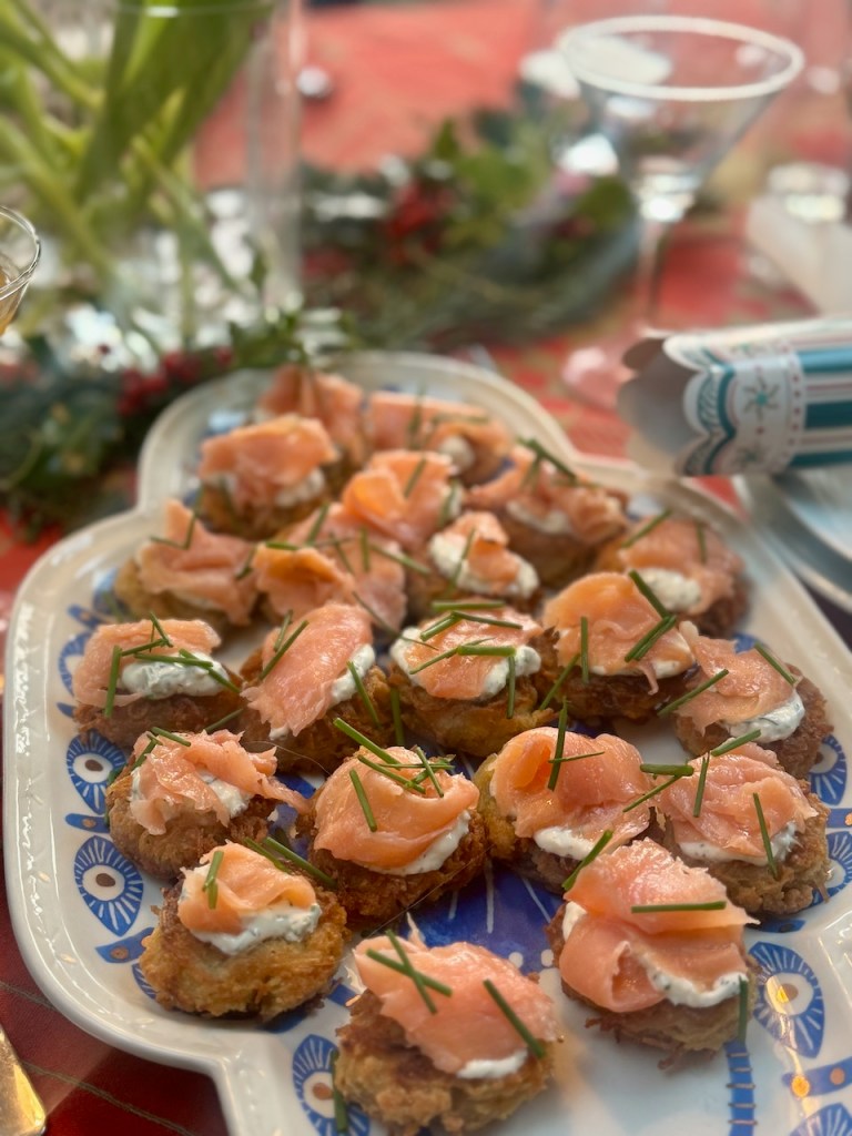 Serve with a dollop of chive sour cream dip (mix 1/2 cup sour cream with 1 tbsp horseradish cream and 1/4 cup snipped chives) and top with a small piece of folded-over smoked salmon and a sprig of chives to garnish.