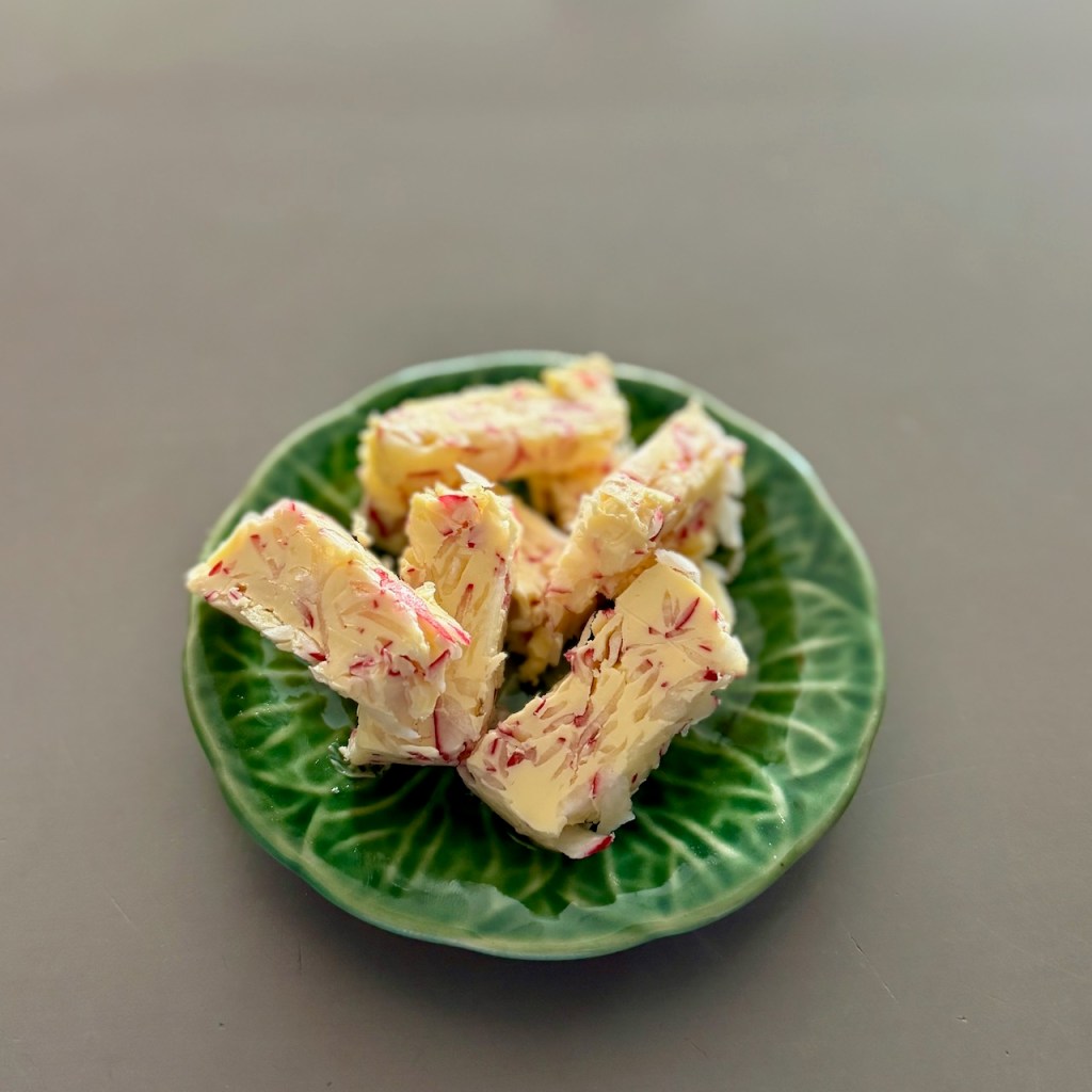 Grate a few radishes using a coarse grater and mix together with 75g unsalted softened butter* (or to your desired ratio of radish to butter). Scrape into a small/individual loaf pan lined with baking paper. Sprinkle with some flaked sea salt and refrigerate till cold.